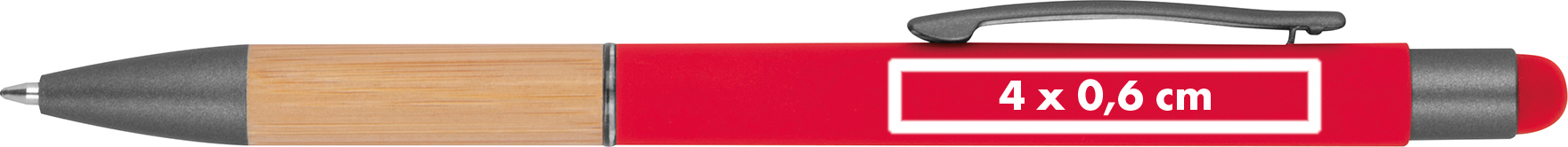 Kugelschreiber aus Aluminium mit blau schreibender Mine, Touchfunktion, matten, silbernen Applikationen und einer Griffzone aus Bambus.Unser Aluminium-Kugelschreiber vereint modernes Design mit praktischen Funktionen. Der elegante Aluminiumkörper wird durch eine Griffzone aus natürlichem Bambus ergänzt, die nicht nur angenehm in der Hand liegt, sondern auch einen stilvollen Kontrast bietet. Die blaue Schreibmine sorgt für ein geschmeidiges Schreiberlebnis, während die integrierte Touchfunktion den Kugelschreiber zu einem vielseitigen Begleiter macht. Ihre Werbung wird rechts vom Clip graviert und hebt Ihre Marke dezent und hochwertig hervor. Produkthighlights: Aluminiumkörper: Langlebig, leicht und mit einem modernen Look. Bambus-Griffzone: Natürliche Akzente für einen angenehmen Griff und stilvolle Optik. Blau schreibende Mine: Sorgt für präzises und flüssiges Schreiben. Integrierte Touchfunktion: Perfekt für die Nutzung von Smartphones und Tablets. Werbeanbringung: Ihr Logo oder Ihre Botschaft wird rechts vom Clip graviert, für eine dezente und professionelle Präsentation Ihrer Marke.