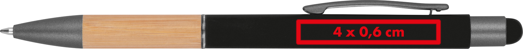 Kugelschreiber aus Aluminium mit blau schreibender Mine, Touchfunktion, matten, silbernen Applikationen und einer Griffzone aus Bambus.Unser Aluminium-Kugelschreiber vereint modernes Design mit praktischen Funktionen. Der elegante Aluminiumkörper wird durch eine Griffzone aus natürlichem Bambus ergänzt, die nicht nur angenehm in der Hand liegt, sondern auch einen stilvollen Kontrast bietet. Die blaue Schreibmine sorgt für ein geschmeidiges Schreiberlebnis, während die integrierte Touchfunktion den Kugelschreiber zu einem vielseitigen Begleiter macht. Ihre Werbung wird rechts vom Clip graviert und hebt Ihre Marke dezent und hochwertig hervor. Produkthighlights: Aluminiumkörper: Langlebig, leicht und mit einem modernen Look. Bambus-Griffzone: Natürliche Akzente für einen angenehmen Griff und stilvolle Optik. Blau schreibende Mine: Sorgt für präzises und flüssiges Schreiben. Integrierte Touchfunktion: Perfekt für die Nutzung von Smartphones und Tablets. Werbeanbringung: Ihr Logo oder Ihre Botschaft wird rechts vom Clip graviert, für eine dezente und professionelle Präsentation Ihrer Marke.