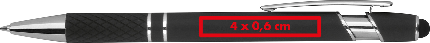 Kugelschreiber aus Aluminium mit silbernen Applikationen, blau schreibender Großraummine, Touchfunktion und gemusterter Griffzone.Unser Aluminium-Kugelschreiber ist ein exklusives Schreibgerät, das nicht nur hervorragende Schreibergebnisse liefert, sondern auch stilvoll und funktional ist. Produkthighlights: Hochwertiges Aluminium: Dieser Kugelschreiber ist aus hochwertigem Aluminium gefertigt, was ihm ein elegantes und modernes Erscheinungsbild verleiht. Blau schreibende Mine: Die blau schreibende Mine sorgt für ein reibungsloses und präzises Schreibgefühl, das in Meetings, im Büro oder unterwegs ideal ist. Touchfunktion: Die integrierte Touchfunktion ermöglicht die bequeme Bedienung von Touchscreens auf Smartphones und Tablets. Gemusterte Griffzone: Die gemusterte Griffzone sorgt für einen rutschfesten Halt und ein angenehmes Schreibgefühl. Silberne Applikationen: Silberne Applikationen verleihen dem Kugelschreiber eine stilvolle Note. Werbeanbringung: Ihr Logo wird rechts neben dem Clip auf den Kugelschreiber graviert, was ihm eine persönliche Note verleiht und ihn zu einem einzigartigen Werbemittel oder Geschenk macht.