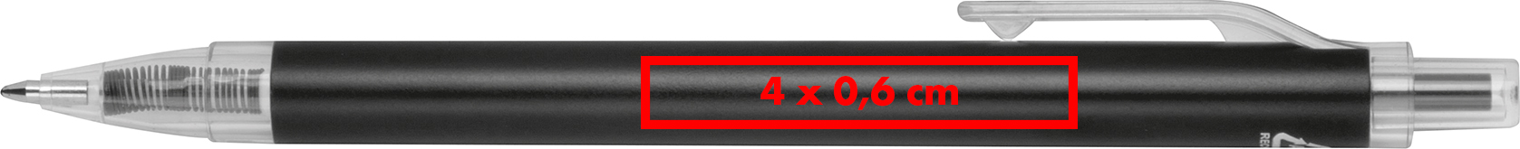 Kugelschreiber aus recyceltem Aluminium und recyceltem Kunststoff (RPET), mit transparentem Clip und blau schreibender Großraummine.Unser Kugelschreiber aus recyceltem Aluminium und recyceltem Kunststoff (RPET) kombiniert nachhaltige Materialien mit einem modernen, leichten Design. Der transparente Clip setzt einen optischen Akzent, während die blau schreibende Großraummine für ein gleichmäßiges Schriftbild und eine lange Schreibleistung sorgt. Ideal für Büro, Schule oder den täglichen Gebrauch. Produkthighlights: Nachhaltige Materialkombination: Gefertigt aus recyceltem Aluminium und recyceltem Kunststoff (RPET). Transparenter Clip: Modernes Design mit praktischer Befestigungsmöglichkeit. Großraummine in Blau: Langlebig und zuverlässig für ausgedehntes Schreiben. Angenehme Handhabung: Leichtes Gewicht für komfortables Schreiben. Werbeanbringung: Ihr Logo gravieren wir hochwertig neben den Clip – ideal als nachhaltiges Werbegeschenk oder individuelles Giveaway.