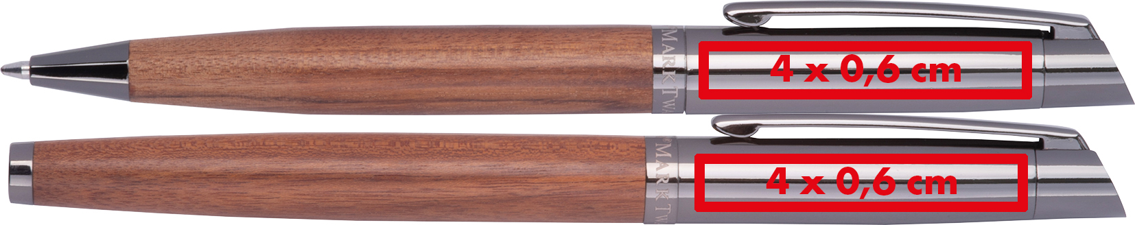 Mark Twain Schreibset aus Edelstahl und Holz. Der Kugelschreiber ist blauschreibend und hat eine Schreiblänge von 1.200m. Der Rollerball ist blauschreibend und hat eine Schreiblänge von 400m.Unser Mark Twain Schreibset aus Edelstahl und Holz vereint zeitlose Eleganz mit hochwertiger Schreibqualität. Das edle Set besteht aus einem Kugelschreiber und einem Rollerball und eignet sich ideal für den täglichen Einsatz im Büro oder als exklusives Geschenk. Die Kombination aus robustem Edelstahl und natürlichem Holz verleiht den Schreibgeräten eine besonders hochwertige und stilvolle Optik. Produkthighlights: Hochwertige Materialkombination: Edelstahl und Holz sorgen für Langlebigkeit und eine edle Haptik. Kugelschreiber in Blau: Mit einer Schreiblänge von ca. 1.200 Metern für langanhaltenden Schreibkomfort. Rollerball in Blau: Gleichmäßiges Schriftbild mit einer Schreiblänge von ca. 400 Metern. Elegantes Schreibset: Ideal für Büro, Meetings oder als hochwertiges Präsent. Werbeanbringung: Ihr Logo gravieren wir hochwertig auf beide Schreibgeräte – perfekt als exklusives Werbegeschenk oder stilvolles Giveaway.