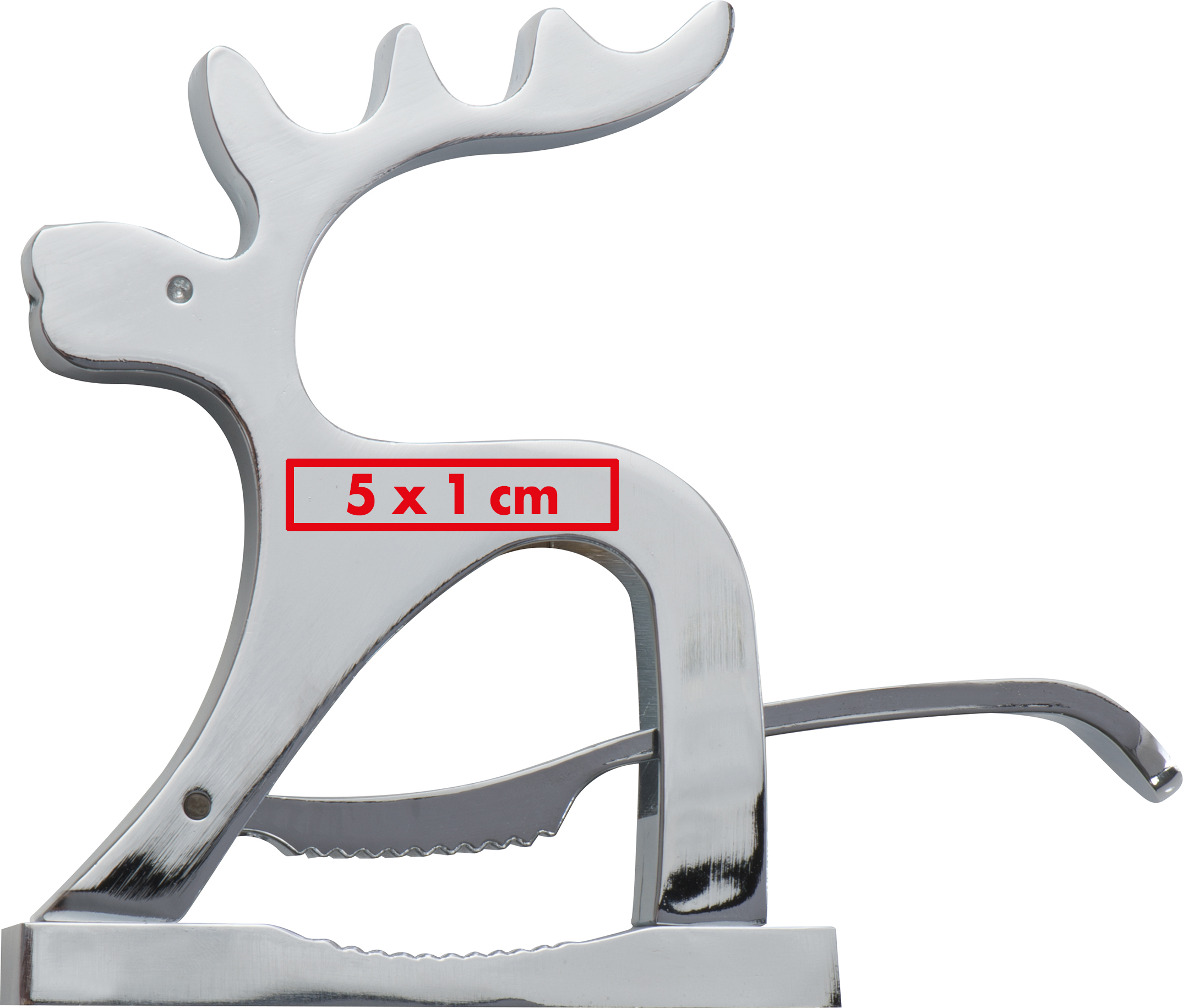 Hochwertiger Nussknacker in der Form eines Elchs aus Metall. Knackt Ihre Nüsse per Hebelmechanismus.Unser hochwertiger Nussknacker in Form eines Elchs aus Metall ist nicht nur ein praktisches Küchenwerkzeug, sondern auch ein charmantes Dekorationsstück. Mit seinem cleveren Hebelmechanismus knackt er Nüsse mühelos und ist dabei ein Blickfang auf Ihrem Tisch oder in Ihrer Küche. Produkthighlights: Stilvolles Elch-Design: Der Nussknacker in Form eines Elchs ist nicht nur funktional, sondern auch ein attraktives Dekorelement, das in der Weihnachtszeit oder das ganze Jahr über verwendet werden kann. Hochwertiges Metall: Hergestellt aus robustem Metall ist dieser Nussknacker langlebig und bereit, viele Nüsse zu knacken. Praktischer Hebelmechanismus: Mit dem Hebelmechanismus öffnen Sie Nüsse mühelos, ohne dabei viel Kraft aufwenden zu müssen. Werbeanbringung: Ihr Logo wird per Lasergravur auf dem Elch angebracht, was diesem Geschenk eine persönliche Note verleiht.
