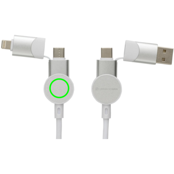 Oakland RCS rKunststoff 1,2m 6-in-1 Fast-Charging 45W KabelDas Gehäuse des Schnellladekabels Oakland besteht aus 100% RCS-zertifiziert recyceltem TPE & Aluminium, das Kabel aus 100% recyceltem TPE-Innen und 100% recycelter PET-Außenschicht. RCS (Recycled Claim Standard) ist ein Standard zur Überprüfung des Recyclinganteils eines Produkts in der gesamten Lieferkette. Dieser Standard wird verwendet, wenn ein Teil des Artikels aus recycelten Materialien hergestellt wurde. 120cm langes Kabel mit 5 verschiedenen Anschlüssen: USB-C In,USB-A In,Typ-C Out,IOS Out und Micro USB Out. Daher auch mit Typ-C Ausgabegeräten verwendbar, wie z.B. neueren Generation von Telefonen und MacBook-Computern. Die USB-A-In/Out-Option sorgt dafür, dass man jedes Gerät von jeder Ausgangsquelle aufladen kann. Maximale Spannung von Typ-C zu Typ-C sind 45W. Urban Vitamin Artikel werden ohne PVC hergestellt. Die Verpackung mit besonders wenig Kunststoff verpackt. Gesamter Recyclinganteil: 52% bezogen auf das Gesamtgewicht des Artikels. Kann Laden und Synchronisieren.