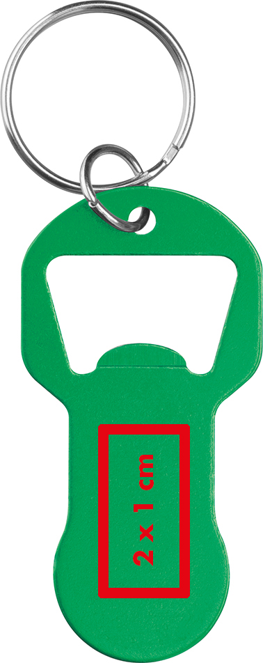 Recycelter Alu Schlüsselanhänger mit Einkaufswagenlöser und Flaschenöffner OLIVER , grün