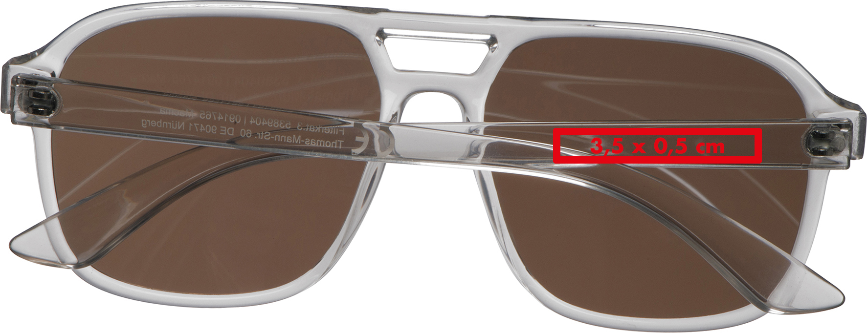 Sonnenbrille mit transparentem Gestell aus recycelten Kunststoffen (rPET) und farbigen Gläsern. Filterkategorie 3 und UV400.Herzlich willkommen zu unserer trendigen Sonnenbrille mit transparentem Gestell aus RPET (recyceltem PET) und farbigen Gläsern – die perfekte Kombination aus Stil und Funktionalität! Diese Sonnenbrille bietet UV400 Schutz und ist in Filterkategorie 3 eingestuft, um Ihre Augen optimal vor schädlichen Sonnenstrahlen zu schützen. Produkthighlights: Transparentes Gestell aus RPET: Das transparente Gestell besteht aus recyceltem PET, was eine ressourcenschonende Option darstellt. Farbige Gläser: Die farbigen Gläser verleihen der Sonnenbrille eine moderne und trendige Optik. UV400 Schutz und Filterkategorie 3: Die Sonnenbrille bietet einen effektiven Schutz vor UV-Strahlen und ist in Filterkategorie 3 eingestuft, um Ihre Augen optimal zu schützen. Werbeanbringung: Ihr Logo wird auf einen Bügel der Sonnenbrille gedruckt, um eine auffällige und personalisierte Präsentation zu gewährleisten.