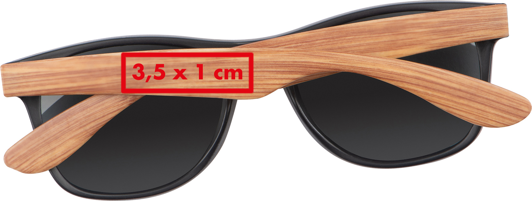 Schwarze Sonnenbrille im klassischen Look mit hochwertigem Kunststoffrahmen und Bügeln in Bambusoptik. Natürlich mit UV 400 Schutz, Filterkategorie 3.Stilvoller Sonnenschutz: Unsere klassische Sonnenbrille mit Kunststoffrahmen und Bügeln in Bambusoptik, inklusive Ihrer individuellen Werbung! Unsere Sonnenbrille bietet nicht nur Schutz vor der Sonne, sondern ist auch ein stilvolles Accessoire und eine effektive Werbeplattform. Produkthighlights: Klassischer Look: Die Sonnenbrille hat einen zeitlosen, klassischen Stil, der zu jedem Outfit passt. Hochwertiger Kunststoffrahmen: Der Kunststoffrahmen bietet Langlebigkeit und ein angenehmes Tragegefühl. Bügel in Bambusoptik: Die Bügel in Bambusoptik verleihen der Sonnenbrille einen natürlichen und edlen Touch. UV 400 Schutz: Die Gläser bieten zuverlässigen UV 400 Schutz und entsprechen Filterkategorie 3, um Ihre Augen optimal zu schützen. Werbeanbringung: Ihre Werbung wird auf einen der Bügel der Sonnenbrille gedruckt, um sicherzustellen, dass Ihre Marke stilsicher präsentiert wird.