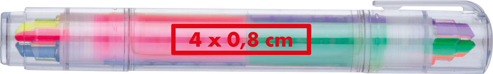 Textmarker-Set mit 6 unterschiedlichen Markierfarben. Auf jeder Seite befinden sich jeweils drei Markierfarben.Unser Textmarker-Set mit 6 unterschiedlichen Markierfarben ist der ideale Begleiter für Schule, Studium oder Büro. Die übersichtliche Anordnung mit jeweils drei Markierfarben pro Seite sorgt für eine kompakte Form und schnellen Zugriff auf die gewünschte Farbe. Perfekt zum Markieren, Strukturieren und Hervorheben von Texten. Produkthighlights: 6 leuchtende Markierfarben: Ideal zum Hervorheben und Strukturieren von Texten. Kompaktes Design: Jeweils drei Markierfarben pro Seite für platzsparende Aufbewahrung. Vielseitig einsetzbar: Perfekt für Schule, Studium, Büro oder Zuhause. Einfache Handhabung: Schneller Farbwechsel durch übersichtliche Anordnung. Werbeanbringung: Ihr Logo drucken wir mittig auf den Textmarker – ideal als praktisches Werbegeschenk oder farbenfrohes Giveaway.