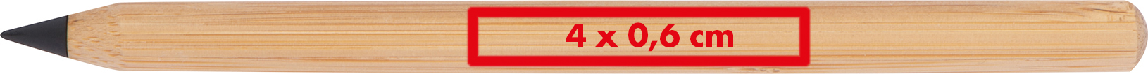 Schreibgerät aus Bambus mit einer legierten Mine, die auf dem Papier oxidiert.Unser Schreibgerät aus Bambus vereint Eleganz mit innovativer Schreibtechnologie. Mit einem Schaft aus Bambus und einer einzigartigen legierten Mine, die ein nicht radierbares graues Schriftbild erzeugt, ist es ein stilvolles und funktionales Werkzeug. Ihre Werbung wird auf den Bambus-Schaft graviert und verleiht dem Schreibgerät eine persönliche Note, die Ihre Marke dezent und edel präsentiert. Produkthighlights: Bambuskorpus: Gefertigt aus natürlichem Bambus, der für eine angenehme Haptik und ein elegantes Erscheinungsbild sorgt. Einzigartige legierte Mine: Erzeugt ein oxidiertes, graues Schriftbild, das nicht radierbar ist und einen klassischen Touch verleiht. Geschmeidiges Schreiberlebnis: Präzise und angenehm für alle Arten von Schriftstücken. Zeitloses Design: Ein stilvolles Accessoire für Büro, Schule oder Zuhause. Werbeanbringung: Ihr Logo oder Ihre Botschaft wird auf den Bambus-Schaft graviert, für eine langlebige und stilvolle Markenpräsentation.
